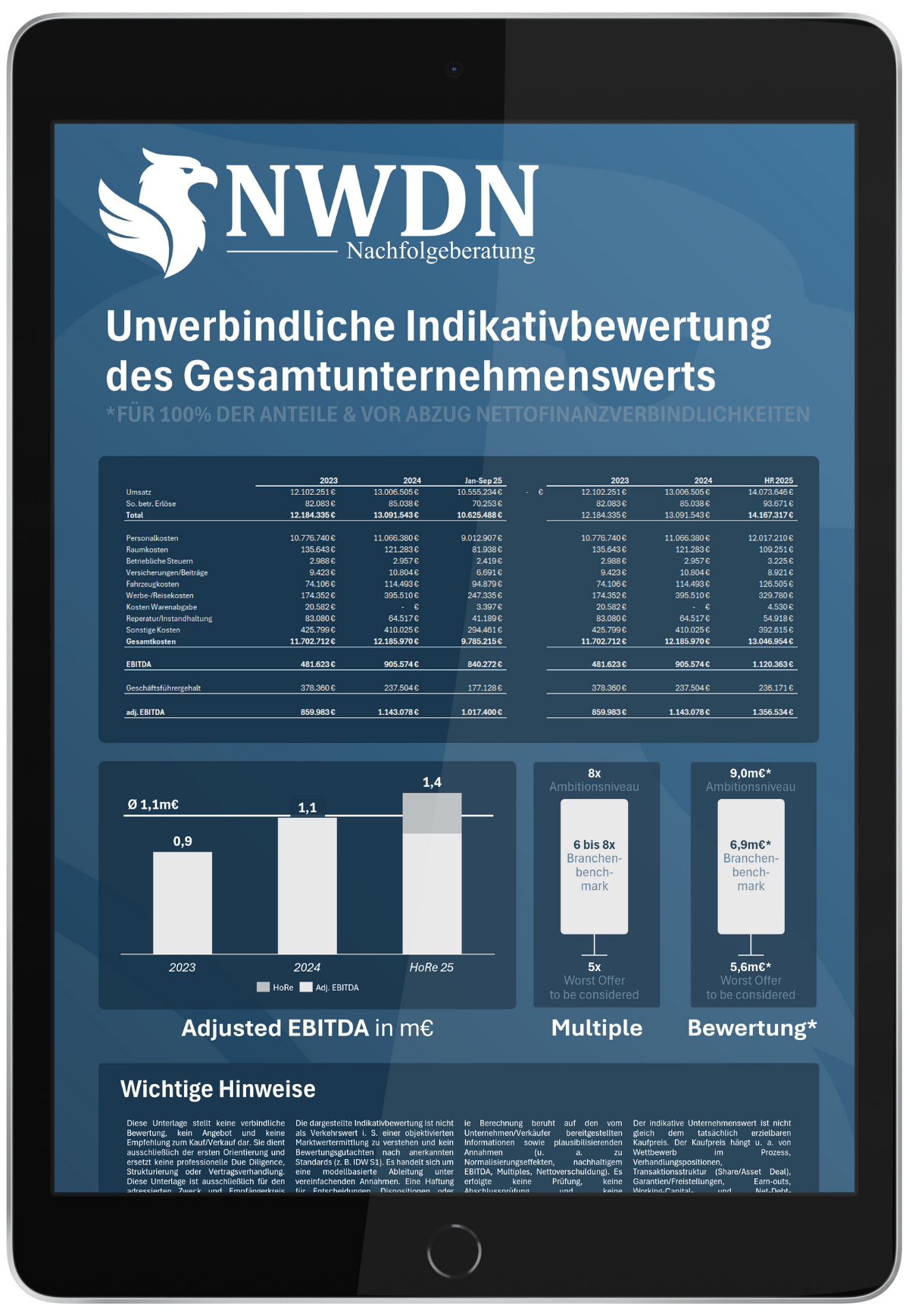 Nach Unterzeichnung einer Vertraulichkeitsvereinbarung erstellen wir eine unverbindliche Indikativbewertung Ihres Unternehmens. Grundlage sind die von Ihnen bereitgestellten Unterlagen (z. B. letzte BWAs/Jahresabschlüsse, ggf. Unternehmensplanung). Wir …